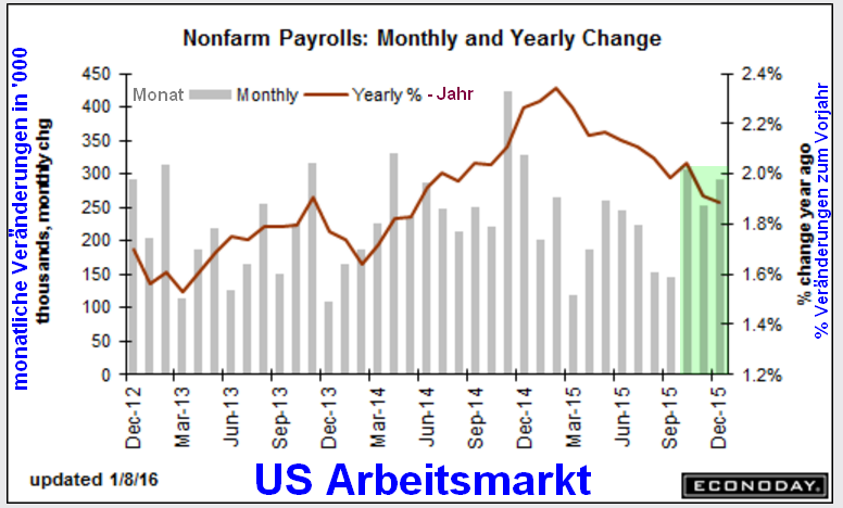 Im Dezember wurden in Amerika 292.000 neue Arbeitsplätze geschaffen. Dies lag deutlich über den allgemeinen Schätzungen. Das vierte Quartal (grüne Schattierung) war insgesamt sehr beeindruckend. Die Arbeitslosenrate beträgt 5% und hat sich seit Oktober 2009 halbiert. Dennoch hat die Börse diese positiven Daten am Freitag im Tagesverlauf ignoriert.